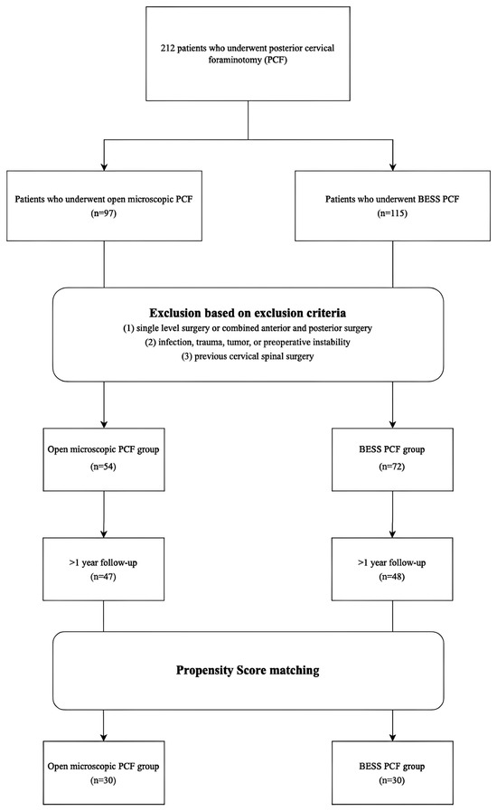 This retrospective cohort study was approved by the institutional review board (IRB no. 2024AN0349 and approval date 8 May 2024) and adhered to the ethical guidelines of the World Medical Association Declaration of Helsinki. Obtaining informed consent was waived due to the retrospective study design. This study complied with the guidelines of the Strengthening the Reporting of Observational Studies in Epidemiology (STROBE) for cohort studies [15,16]. In total, 212 patients who underwent open microscopic PCF or BESS PCF as the treatment for cervical radiculopathy between August 2016 and June 2023 were investigated for eligibility. PCF was selected in cases where radiculopathy was the primary symptom, and the pathology was limited to foraminal stenosis or laterally located soft disc protrusions without significant ventral compression. Patients with unilateral radiculopathy who expressed concerns about anterior approaches due to neck scarring or implant-related discomfort were also considered for PCF. Cases with significant cervical instability or central stenosis, such as myelopathy caused by ossification of the posterior longitudinal ligament, were excluded. The decision between open microscopic PCF and BESS-PCF was made through thorough discussions with the patient. Factors considered during these consultations included the patient’s preference regarding surgical scars, the potential risks associated with each approach, and the anticipated operative time. Patients were provided with comprehensive explanations of both surgical techniques to ensure an informed decision. All surgeries were performed by a single spine surgeon (H.R.L.) with expertise in cervical spine procedures. Exclusion criteria were as follows: (1) patients who underwent single-level surgery or combined anterior and posterior surgery; (2) patients with infection, trauma, tumours, or preoperative instability; and (3) patients with a history of previous cervical spinal surgery.