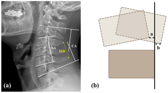 Figure 2. Radiologic measurements. (a) The segmental angle (SA) was the Cobb’s angle between the inferior endplate of the lower vertebrae and superior endplate of the upper vertebrae. The cervical angle (CA) was the angle between lines which were parallel to the trailing edge of C2 and C7. The interspinous distance (ISD) was defined as the distance between midpoints of edges of the spinous processes. (b) The gliding distance of the cervical spine (GD) at the corresponding disc level in flexion and extension positions. Gliding distance of cervical spine = a (flexion) + b (extension).