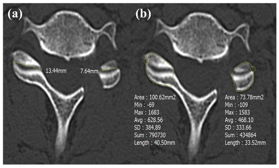 Cervical disc degeneration was assessed using the Pfirrmann classification, which grades disc degeneration on T2-weighted preoperative cervical MRI images into five categories [19,20]. On a flexion–extension lateral dynamic radiograph, gliding distances were measured in both flexion and extension positions (Figure 2) [21]. To investigate the facetectomy amount, the area and length of the contralateral facet (A) and the residual facet (B) were measured on postoperative CT scans. The facetectomy percentage was calculated with the following formula: Facetectomy (%) = (A − B) × 100/A (Figure 3) [22]. The extent of joint resection was evaluated in the axial plane, reconstructed parallel to the disc level in accordance with our standard CT protocol.