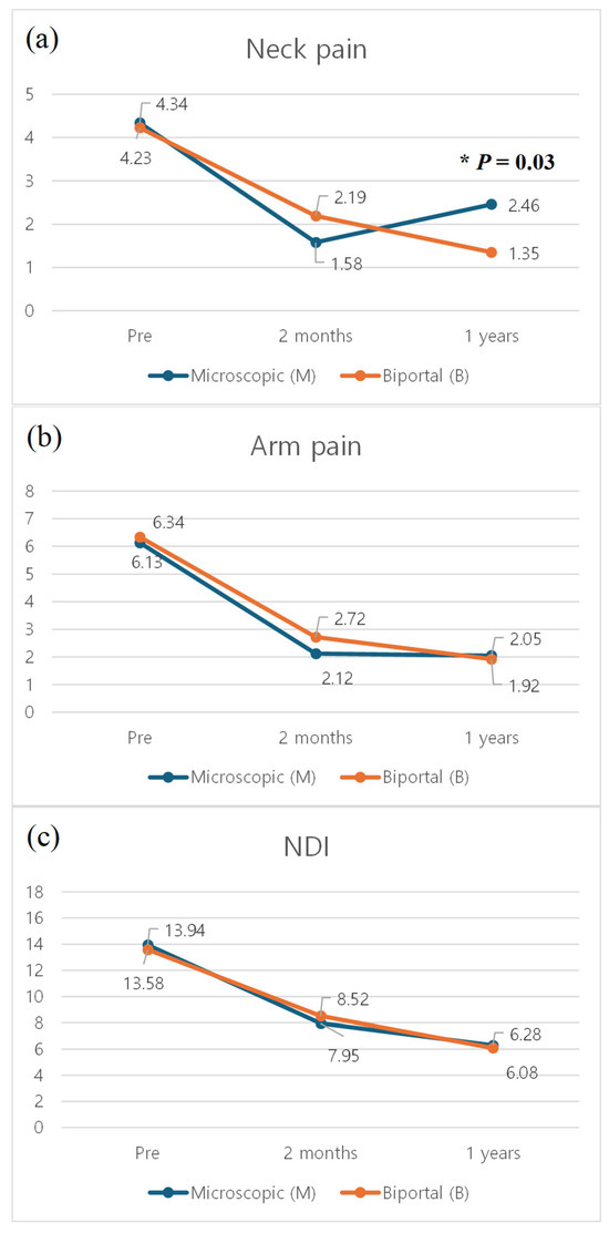Regarding clinical outcomes, both groups demonstrated improvement following surgery. There was no difference between the two groups in terms of the arm pain VAS and the NDI at every time point. In the neck pain VAS, Group M showed more adverse outcomes than Group B at final follow-up (Figure 4).