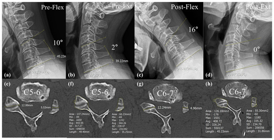 Figure 5. Representative patient from Group O. (a,b) Preoperative flexion cervical lateral radiograph showing a 10-degree kyphotic angle at C5–C7 and an extension lateral radiograph showing a 2-degree kyphotic angle. Therefore, the preoperative segmental ROM is 8 degrees. (c,d) Postoperative flexion cervical lateral radiograph showing 16 kyphotic degrees at C5–C7 and an extension lateral radiograph showing 0 degrees. Therefore, the postoperative segmental ROM is 16 degrees, resulting in a segmental ROM gain of 8 degrees. (e,f) The amount of facetectomy at C5–6 was measured by length (57.4%) and area (56.1%). (g,h) The amount of facetectomy at C6–7 was measured by length (59.4%) and area (56.1%).