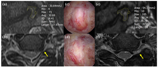 Figure 6. Preoperative and postoperative imaging and surgical process for biportal endoscopic spine surgery (BESS) in multi-level posterior cervical foraminotomy. (a,b) Preoperative magnetic resonance imaging (MRI) of the cervical spine, showing the foraminal and axial views. The foraminal area was measured using PACS software, calculated as 30.64 mm2. The yellow arrow indicates the left foramen. (c,d) Intraoperative views during a two-level cervical foraminotomy using the BESS system, illustrating the precise decompression process. (e,f) Postoperative MRI demonstrating the increased foraminal area (54.47 mm2) in the foraminal view and the widened foramen in the axial view, confirming successful decompression. The yellow arrow indicates the left foramen.