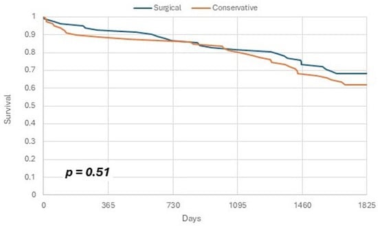 This study also examined whether surgical treatment could mitigate mortality rates in male patients, given the known association of male sex with elevated mortality and heightened complications following surgical treatment for proximal humeral fractures [,]. Our prior research also prompted this subgroup analysis, revealing a large, albeit statistically insignificant, trend of reduced mortality among males undergoing RTSA. The current study, with a somewhat larger population and a longer 5-year follow-up, shows similar results: a trend towards reduced mortality in the male population treated with RTSA, albeit not statistically significant.