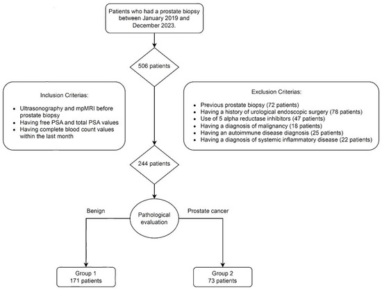 Of the 506 patients who had undergone a prostate biopsy at the urology clinic of Eskisehir City Hospital between January 2019 and December 2023, 244 met the inclusion criteria for this study. From post-pathological evaluation, 171 patients (71.1%) with benign biopsy results were categorized in Group 1, and 73 patients (29.9%) with PCa were categorized in Group 2 (