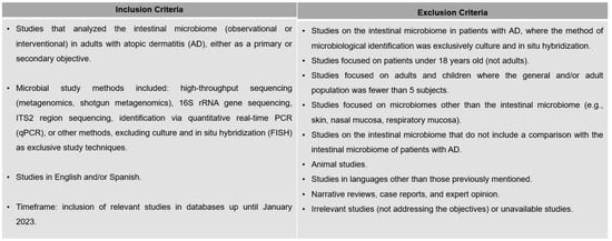 Chicago/Turabian StyleDíez-Madueño, Kevin, Pablo de la Cueva Dobao, Isabel Torres-Rojas, Marta Fernández-Gosende, Claudio Hidalgo-Cantabrana, and Pablo Coto-Segura. 2025. "Gut Dysbiosis and Adult Atopic Dermatitis: A Systematic Review" Journal of Clinical Medicine 14, no. 1: 19. https://doi.org/10.3390/jcm14010019