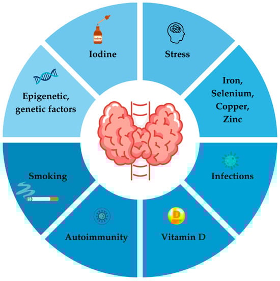 The key environmental factors involved in development of AITD are iodine excess, deficiency of selenium, iron and vitamin D, smoking, stress and infections [,] as shown on Figure 2.