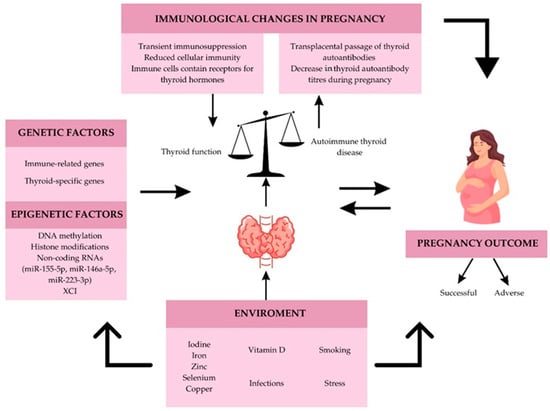 The complex network of factors that influence thyroid function and pregnancy outcome. Both thyroid function and a successful pregnancy are influenced by genetic and epigenetic predispositions as well as environmental factors that, when out of balance, can lead to AITD and an adverse pregnancy outcome. Immunomodulation during pregnancy, which is necessary for a successful pregnancy outcome, also affects thyroid function, especially in the presence of AITD. On the other hand, autoimmunity of the thyroid gland can affect the normal immunological changes and the outcome of pregnancy.