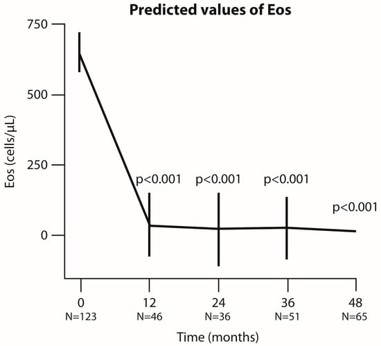 Analysis of eosinophil count at each time point of the follow-up period (in months). Graphical representation of eosinophil (Eos) values predicted by the linear mixed-effects (LMER) model. The bars indicate the 95% confidence interval (CI), and N represents the number of patients analyzed at each time point. p-values refer to the comparison between each time point and baseline.