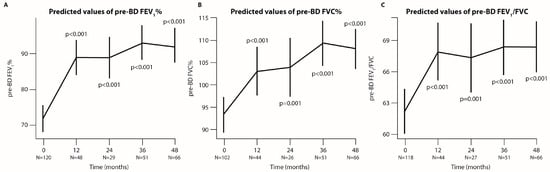 Analysis of lung function measured through pre-BD FEV1, pre-BD FVC, and pre-BD FEV1/FVC at each time point of the follow-up period (in months). Graphical representation of pre-BD FEV1 (A), pre-BD FVC% (B), and pre-BD FEV1/FVC (C) values predicted by linear mixed-effect (LMER) model. The bars indicate the 95% CI, and N represents the number of patients analyzed at each time point. p-values refer to the comparison between each time point and baseline.