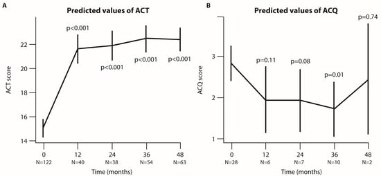 Analysis of ACT and ACQ scores at each time point of the follow-up period (in months). Graphical representation of ACT (A) and ACQ (B) predicted scores based on the linear mixed-effect (LMER) model. The bars indicate the 95% CI, and N represents the number of patients analyzed at each time point. p-values refer to the comparison between each time point and baseline.