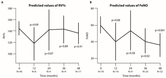 Analysis of RV% and FeNO predicted values at each time point of the follow-up period (in months). Graphical representation of RV% (A) and FeNO (B) predicted values based on the linear mixed-effect (LMER) model. The bars indicate 95% CI, and N represents the number of patients analyzed at each time point. p-values refer to the comparison between each time point and baseline.