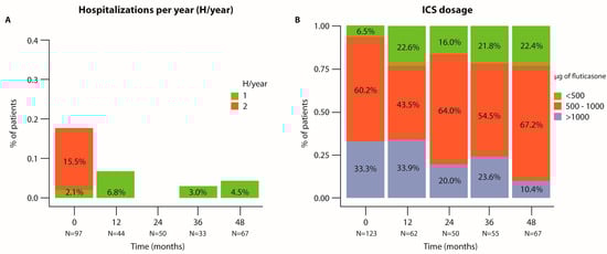 Analysis of hospitalizations and dosage of ICS at each time point of the follow-up period (in months). Graphical representation of the percentage of patients who were hospitalized 1 or 2 times during the follow-up period (A) and the percentage of patients who used during the follow-up period an ICS dosage (μg of fluticasone) <500, 500–1000, or >1000. (B). N represents the number of patients analyzed at each time point. The analysis was performed using the chi-square test.