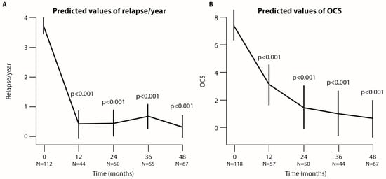 Analysis of relapses per year and OCS dosage used at each time point of the follow-up period (in months). Graphical representation of the number of relapses (A) and OCS dosage (B) predicted by linear mixed-effect (LMER) model. The bars indicate the 95% CI, and N represents the number of patients analyzed at each time point. p-values refer to the comparison between each time point and baseline.