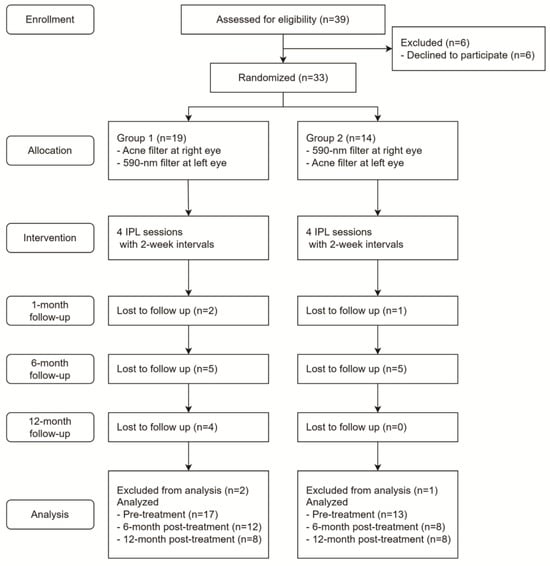 A total of 33 patients were randomly assigned and divided into two separate groups (Figure 1). A randomization sequence was created using random block sizes of 2, 4, and 6 by an independent doctor. The allocation sequence was concealed from the physician enrolling and assessing the patients using numbered, opaque, and sealed envelopes. Outcome assessors and data analysts were blinded to the allocations. In Group I, 19 patients received IPL treatments using an acne filter in the right eye and a 590-nm filter in the left eye. In Group II, 14 patients received IPL treatments using a 590-nm filter in the right eye and an acne filter in the left eye. One month after the fourth IPL treatment performed at two-week intervals, two patients in Group I and one patient in Group II were lost to follow-up. Six months after the final IPL treatment, an additional five patients in each group were lost to follow-up. Twelve months after the final treatment, an additional four patients in Group I were lost to follow-up. Patients who were not followed up one month after treatment were excluded from the analysis. The flow of the patients through this study is shown in Figure 1.