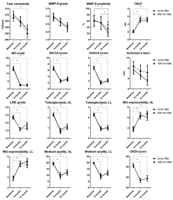 When combining the results from both filters, the time effects on tear osmolarity, MMP-9 grades and positivity, TBUT, NEI scales, SICCA scores, Oxford scores, LWE grades, upper and lower lid margin telangiectasia scores, upper and lower lid MG expressibility/secretion scores, and OSDI scores were significant (tear osmolarity: p = 0.001; MMP-9 grades: p = 0.017; MMP-9 positivity: p = 0.003; all other measurements: p < 0.001). In the post hoc analysis, significant improvements in all these parameters, except for tear osmolarity and MMP-9 grades and positivity, were observed at both 6 and 12 months after their last treatment compared to baseline. Comparisons of the p-values at baseline vs. 6 months and baseline vs. 12 months are as follows: lower lid secretion scores (p < 0.001 and p = 0.001); all other measurements (p < 0.001). No significant difference was observed in these parameters between 6 and 12 months after their last treatment. Tear osmolarity and MMP-9 grades improved significantly only at 12 months after their last treatment compared to baseline (tear osmolarity: p = 0.001; MMP-9 grades: p = 0.013 for baseline vs. 12-month comparisons), and the positivity rates of MMP-9 decreased significantly at 12 months after their last treatment compared to baseline and 6 months after their last treatment (p < 0.001 for baseline vs. 6-month and p = 0.003 for 6-month vs. 12-month comparisons).