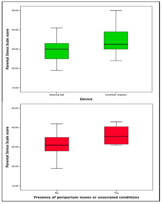 Boxplot representing Parental Stress Scale scores among hearing aid vs. cochlear implant users and in children with peripartum issues or associated conditions.