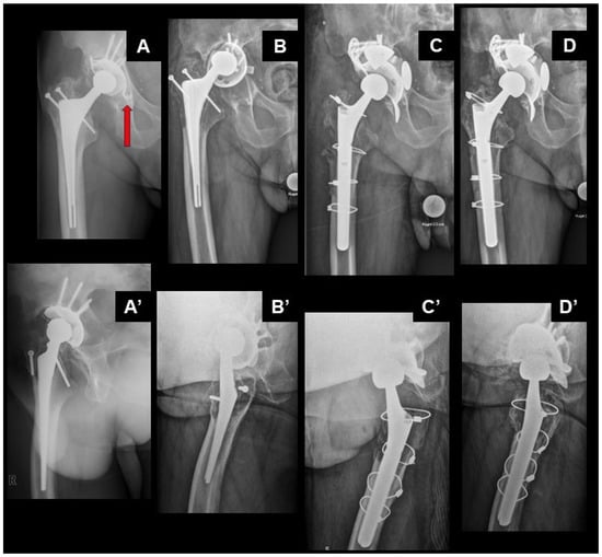 Zone of interest of anteroposterior radiographs of the pelvis showing the right hip (A–D), respectively corresponding faux-profile (A’) or axial radiographs (B’–D’). The oldest radiographs available are from 11 years after THA, respectively 9 years after the first revision of the cup, 13 years before the revision described (A,A’). Note the metal-polyethylene-sandwich cup and the small-diameter metal-on-metal bearing, as well as the improper placement of the reinforcement ring. The hook normally should engage the acetabular fossa to reduce the risk of dislocation (arrow). Dislocated hip implant 3 months before revision illustrated in (B,B’). Postoperative radiographs after revision are illustrated in (C,C’). Note successful reconstruction of the centre of rotation and of the leg length. Follow-up 3 years after revision in (D,D’).
