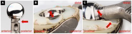 Macrophotographs of the retrievals. In (A) implant head and neck with a posteriorly situated wear defect, measuring 13 mm in width, 4.4 mm from proximal to distal, with a depth of 4.25 mm. Total volume loss thus measured approximately 162 mm3, considering the defect as a half-cylinder. In (B), illustration of the cup, showing a posterior wear defect. In (C), illustration of both the cup and the stem assembled, showing posterior component impingement. The defect zones align perfectly. The edge of the cobalt-chromium-alloy cup of the metal-polyethylene-sandwich cut into the softer titanium alloy of the stem during repetitive impingement, whereas the neck caused a defect of the softer polyethylene (red arrows).