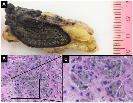 In (A), macrophotograph of the sectioned periarticular solid black necrotic tumor, which was located posteriorly to the hip joint, having a diameter of 3.8 cm after fixation, surrounded by adipose tissue. In (B,C), microphotograph at high magnification (hematoxylin and eosin staining ×200 in (B) and ×400 in (C), depicting proliferated macrophages showing basophilic stained oval nuclei and expanded cytoplasm, containing numerous phagocyted black metal microparticles (two macrophages delineated with a dotted white line).