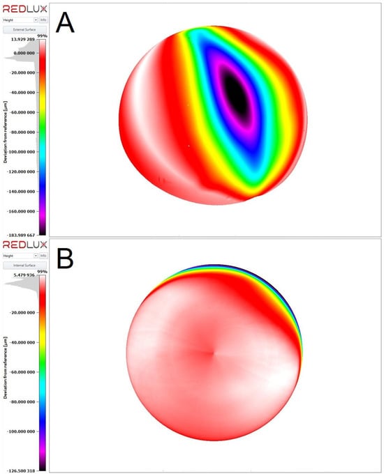 Heat maps showing bearing surface wear based on metrology data collected with an optical coordinate measuring machine (RedLux, Ortholux). (A) shows a narrow wear scar on the head’s bearing surface, which is characteristic for edge loading. The wear of the head amounted to 32.34 mm3. The wear scar of the metal liner is shown in (B), located at the rim and was associated with 8.02 mm3 of material loss. Total wear of the bearing surfaces amounts to 40.36 mm3, which is only a fourth of the defect size of the neck of the implant.