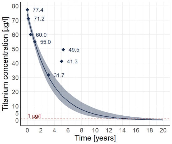 Graphical illustration of the titanium concentrations in whole blood over time observed in the patient described. Expected concentrations were extrapolated from the individual measurements, not considering the last two values, as an unexplained secondary increase was observed. The calculated elimination half-life of titanium in the blood in this patient thus was 2 years and 233 days. Without this secondary increase, normalisation of the titanium concentration would not have been expected before 14 years postoperatively. The dotted line at 1 µg/L marks the normal reference value.