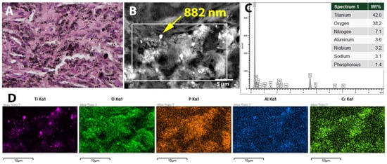 In (A), high magnification photomicrograph demonstrating dense metal debris within macrophages (haematoxylin and eosin, ×600). In (B), backscattered scanning electron micrograph of the same metal particle-containing area as in A (×4000). In (C), EDS spectrum of the bright 882 nm particle marked in (B) (yellow arrow), showing an elemental composition corresponding to the titanium alloy (TiAlNb) of the stem. In (D), EDS mapping of the area within the white box of (B), showing the location and composition of the particles seen in (A,B).