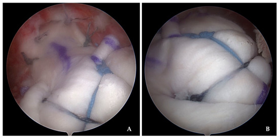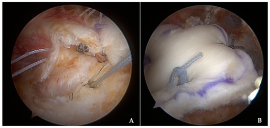 In all patients, a complete inspection of the glenohumeral joint was carried out through standard posterior viewing and anterior working portals to assess intraoperative tendon quality and other pathologies. Biceps tendons were performed with tenodesis with subsequent tenotomy. The tear size was measured using a graduated ruler for the medial-to-lateral length and anterior-to-posterior width. Reducibility of the torn cuff tendons to the original footprint at the tuberosity was assessed after the release of the adherent rotator cuff with bursectomy and before any procedure regarding biceps and rotator cuffs. In addition, acromioplasty was completed in all patients, and a thorough bursectomy was performed to gain proper visualization of subacromial space.