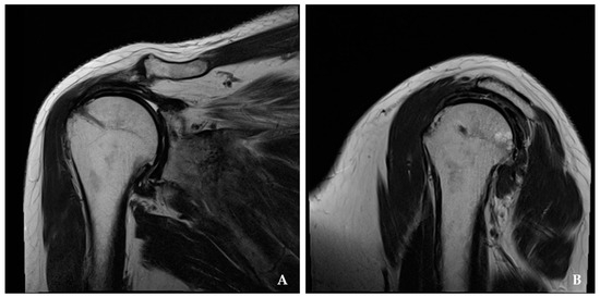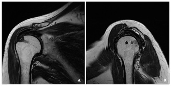 Superior capsular reconstruction with the acellular dermal allograft is shown at the postoperative 1 year. (A) magnetic resonance imaging of T1 coronal section. (B) magnetic resonance imaging of T1.