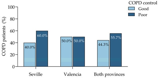 From the initial cohort of 110 patients, four from the Valencia cohort were excluded due to a lack of prescribed maintenance or rescue medication in the previous year. These patients, initially classified as having good COPD control, were excluded to prevent potential bias, as their apparent control status likely reflected incomplete treatment records rather than their actual clinical condition (see Section 2.6) [29]. This adjustment resulted in a final cohort of 106 patients, 60 from Seville and the remainder from Valencia, with a mean age of 68.8 ± 8.2 years, predominantly male (72.6%).