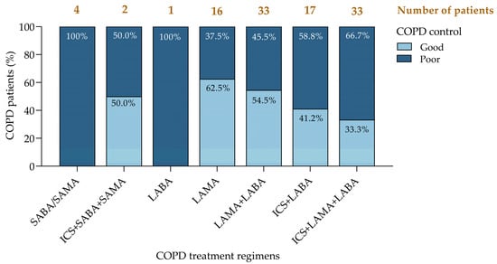 The treatment regimen of COPD patients showed a tendency related with the degree of disease control (Figure 3). Long-acting beta-agonist (LABA), dual bronchodilation (LABA plus long-acting muscarinic antagonist [LAMA]), and inhaled corticosteroid (ICS) regimens showed the highest association with poor disease control probably reflecting a subgroup of patients with more severe diseases or more frequent exacerbations (Figure 3). Similarly, SABA or SAMA in monotherapy was associated with 100% poor control, highlighting its inadequacy for achieving proper disease management. In contrast, the LAMA treatment as a monotherapy showed the lowest proportion of poor control (37.5%), suggesting its effectiveness in patients with less severe diseases or with specific phenotypic profiles (Figure 3).