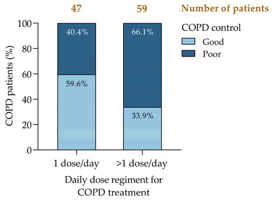 We found a significant association between once-daily inhaler therapy regimens and improved COPD control (Figure 4). Patients on once-daily regimes exhibited a higher proportion of good disease control (59.6%) compared to those requiring multiple daily doses (33.9%) (Figure 4). In contrast, poor COPD control was significantly more frequent among patients requiring multiple inhalations per day (66.1%). The relevance of our findings was confirmed by a statistical analysis: a chi-squared test yielded a value of 6.96 (p = 0.008), allowing rejection of the null hypothesis of independence, and the Cramer’s V coefficient was 0.256, highlighting a moderate association and emphasizing the clinical relevance of dosing simplification.
