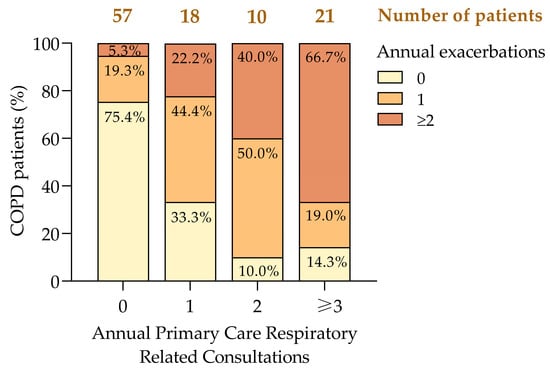 The frequency of exacerbations was strongly associated with an increased healthcare utilization, consistent with previous studies [8,39]. A one-tailed paired t-test confirmed a significant correlation between annual exacerbations and respiratory consultations (p = 0.010), indicating that patients with frequent exacerbations required more healthcare resources.