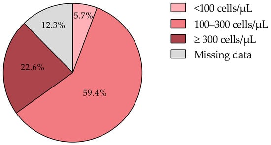 In alignment with the GOLD 2024 guidelines, ICSs are recommended for patients with a history of hospitalization due to COPD exacerbations, two or more moderate exacerbations annually, or eosinophil counts ≥ 300 cells/µL. Conversely, ICSs should be avoided in patients with counts < 100 cells/µL or with a history of mycobacterial infections or recurrent pneumonia [43]. In our cohort, only 5.7% had eosinophil counts < 100 cells/µL (Figure 7), suggesting that ICS therapy may not be necessary for this subgroup.