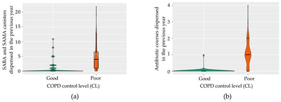 Current COPD risk and control models, such as those proposed in the GOLD 2024 and GesEPOC 2021 frameworks, primarily rely on spirometry, symptom assessments, and exacerbation history [1,11]. However, these approaches may fail to identify patients at risk who experience moderate exacerbations or exhibit elevated SABA use, both of which are strongly linked to worsening clinical outcomes [14,15,16,17,18,19,20,21]. Moderate exacerbations—defined as episodes requiring systemic corticosteroids and/or antibiotics without hospitalization—and the use of three or more SABA canisters annually are established predictors of increased exacerbation risk and suboptimal disease management [9,13,14,15,16,17,18,19,20,21].