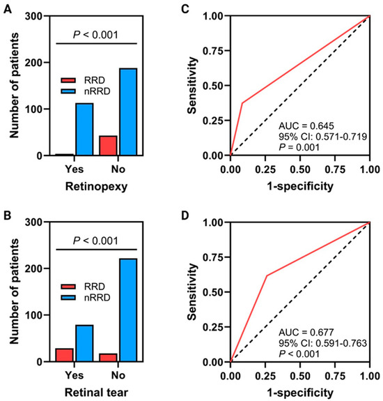 (A,B) Showed the relation between the presence of retinal tears and performing retinopexy and between the development of fellow-eye RRD. (C,D) ROC curves for the prediction of these relationships (the dotted black line represents the diagonal of no discrimination, the red line represents the tested variables).