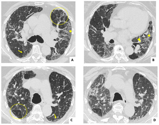 Inspiratory axial HRCT images (A–C) in a 65-year-old woman diagnosed with isolated ANCA-ILD and positive C-ANCA. Pictures show reticulation (arrows), traction bronchiectasis (arrowhead), and ground glass opacities (asterisks), with no craniocaudal gradient. Bilateral mosaic pattern (geographic regions of decreased lung density) can also be detected (circles). Expiratory CT (D) confirms the presence of air trapping, and the mosaic pattern is highlighted compared to C. Findings suggest a non-UIP fibrotic interstitial lung disease.