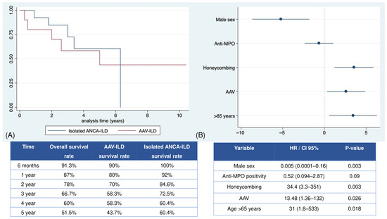 Overall and stratified survival in the population with ILD and positive ANCA. (A) Kaplan–Meier survival curves for isolated ANCA-ILD or AAV_ILD based on the cumulative probability of survival. (B) Forest plot of the regression Cox analysis of the risk factors associated with premature mortality. Abbreviations: ANCA: anti-neutrophil cytoplasmic antibody; AAV: ANCA-associated vasculitis; Anti-MPO: anti-myeloperoxidase antibody; CI: confidence interval; HR: hazard ratio. ILD: interstitial lung disease.