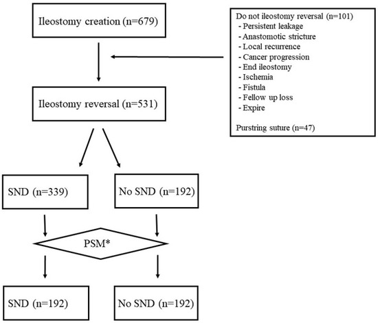 R software version 4.0.0 (Foundation for Statistical Computing, Vienna, Austria) was used as the statistical tool. An independent t-test, chi-squared test, and Fisher’s exact test were used for statistical analysis. Statistical significance was set at p < 0.05. PSM is used to reduce bias in retrospective studies in which a randomized control study is unable to be conducted. We, therefore, employed PSM. Propensity scores were calculated using bivariate logistic regression. A 1:1 PSM was performed for the SND and no SND groups. The variables considered for matching were SSI risk estimated using the ACS NSQIP risk calculator and the presence of a parastomal hernia.