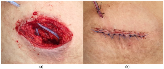 Subcutaneous negative-suction drainage (SND) insertion after fascia closure. (a) SND* insertion state. (b) Wound closure state. * Subcutaneous negative-suction drainage.