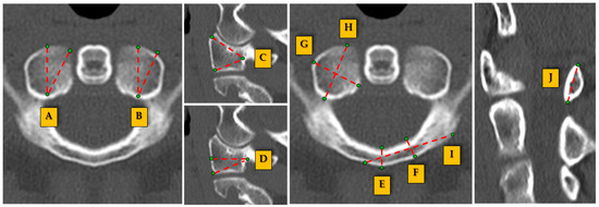 C1 measurements (Figure 1): (A) Angle of screw directed to maximal medial: the angle formed by a line directed medially through the lateral mass, representing the optimal trajectory for screw insertion in medial placement. (B) The angle of screw directed to the maximal lateral: the angle that extends laterally, ensuring safe and stable screw placement, while avoiding cortical breaches. (C) The angle of screw directed to maximal cranial: measured from the inferior aspect of the C1 lateral mass, this angle represents cranial screw trajectory. (D) The angle of screw directed to maximal caudal: the angle directed caudally from the C1 posterior arch, assessing the downward trajectory of the screws. (E) Posterior tubercle bicortical diameter: the bicortical diameter measured across the posterior tubercle, indicating the bone’s capacity to accommodate bicortical screw placement. (F) Bicortical diameter: the total diameter across the C1 lateral mass, aiding in understanding the safe diameter for bicortical screw fixation. (G) Transverse width: measured from one lateral mass to the other, providing insight into the width of C1 and the space available for surgical access. (H) Anteroposterior (AP) dimension: the distance measured from the anterior to the posterior aspects of the C1 arch, relevant for ensuring safe anterior or posterior screw placement. (I) C1 lamina length: the length of the lamina spanning the posterior arch of C1, crucial for posterior surgical approaches. (J) C1 lamina height: the vertical height of the C1 lamina, which contributes to understanding the space available for instrumentation.