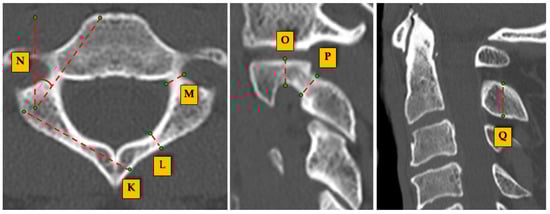 C2 measurements (Figure 2): (K) C2 lamina length: the length of the C2 lamina from the base to the posterior edge, essential for posterior stabilization procedures. (L) C2 lamina bicortical diameter: the bicortical width measured across the lamina, aiding in determining the feasibility of bicortical screw placement. (M) Pedicle width: the transverse measurement across the C2 pedicle, crucial for assessing screw placement to avoid cortical breaches. (N) Pedicle transverse angle: the angle formed by a line drawn through the pedicle in a transverse plane, guiding the appropriate trajectory for pedicle screw insertion. (O) Internal height: the vertical distance from the internal cortical margin of the C2 lamina, indicative of the space available for instrumentation without cortical disruption. (P) Isthmus height: the height of the narrowest segment of the C2 lamina, serving as a limiting factor for screw placement and instrumentation. (Q) Height of the C2 lamina: the total vertical height measured from the upper to the lower cortical surfaces of the C2 lamina, influencing the choice of surgical tools and screw length.