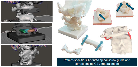 The 3D-printed models enhance the surgeons’ ability to visualize and assess anatomical variations, practice surgical techniques, and plan patient-specific procedures, contributing to improved surgical precision and patient outcomes. The patient-specific, 3D-printed spinal screw guides and corresponding C2 vertebral models are derived from CT imaging data. It highlights advancements in personalized spine surgery planning and execution. The dark blue arrows indicate the trajectory of the screws, while the light blue arrows represent the direction of the screw guides.