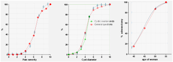 Indications for surgery are multivariate, with at least the severity of pain, the diameter of the cyst, the age of the woman, and other factors such as CA125 and fertility. The red and green lines show the percentage of gynecologists performing surgery when pain severity or the cyst’s diameter are the only symptoms. The third graph illustrates the percentage of adnexectomies at different ages for a 4 cm endometrioma and a CA125 of 50 IU (reprinted with permission from Ref. [26]). The blue dotted lines illustrate the goodness of fit when the relationship is calculated as a sigmoidal relationship between pain 1/(1 + e−1.2(P−6.2)), diameter 1/(1 + e−1.4(D−4.2)), and age 1/(1 + e−4(A−4.5)), respectively.