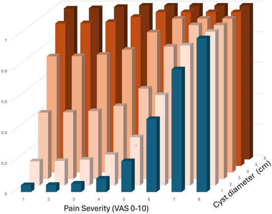 The percentage og gynaecologists performing surgery was calculated for any combination of pain and cyst diameter assuming a sigmoid relationship and no interaction. Using the sigmoidal relationship between the percentage of gynecologists performing surgery due to the severity of pain (blue bars representing data of left graph of Figure 1; percentage performing surgery = 1/(1 + e−1.2(P−6.2)) and the cyst diameter (left of the graph—intensity of red colours; percentage performing surgery = 1/(1 + e−1.4(D−4.2)), thet percentage gyneclogists performing surgery was calculate for any combination, of pain and cyst diameter assuming no interaction.