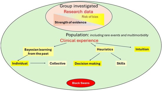 Endometriosis management is based on the evidence sourced from research data on the groups of women investigated (small rose-colored ellipse); this should be updated with clinical experience in the entire population (large green ellipse), including rare events and multimorbidity. Clinical experience comprises conscious Bayesian learning from the past, either individually or collectively, as well as heuristics in decision-making and skills and the less conscious form of intuition. The risk of bias is indicated in yellow. However, decisions should consider not only the evidence but also the risk of causing harm, as indicated by black swans, which present as random and unpredictable complications.