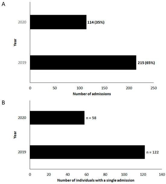 (A) Total number of admissions for an acute exacerbation of COPD in 2019–2020, and (B) total number of individuals with a single admission for an acute exacerbation of COPD in 2019–2020.