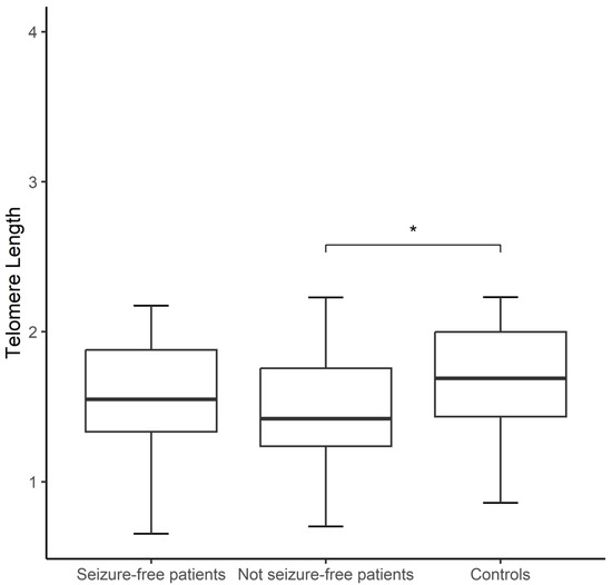 Boxplot showing comparison of telomere lengths (TLs) of seizure-free patients (n = 22), not seizure-free patients (n = 42), and controls (n = 64). Student’s t-test was used. Significance is denoted by an asterisk as follows: * p < 0.05.