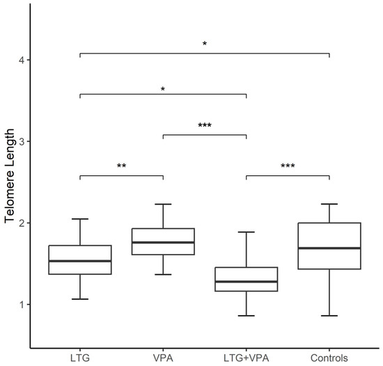 Boxplot showing comparison of telomere lengths (TLs) among epilepsy patients grouped by antiseizure drug treatment (ASD) and controls (n = 64) as follows: patients on lamotrigine (LTG, n = 18); patients on valproic acid (VPA, n = 19); patients on LTG + VPA (n = 27). TL of each group of epilepsy patients compared to controls and TL differences among patients grouped by ASD treatment was performed with Kruskal–Wallis test. Significance is denoted by asterisks as follows: * p < 0.05, ** p < 0.01, and *** p < 0.001.