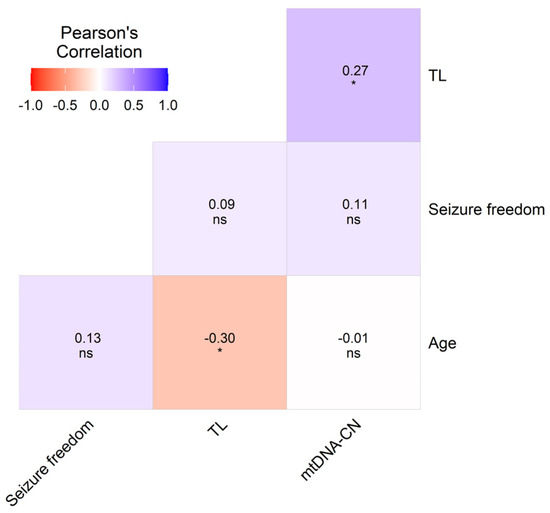 Heatmap matrix depicting the multiple Pearson correlations between TL, mtDNA-CN, sex, age, and clinical variables with significant values in included epilepsy patients (n = 64). Significance is denoted by asterisk as follows: * p < 0.05.