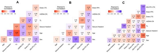 Heatmap matrix depicting the multiple Pearson correlations between TL, mtDNA-CN, sex, age, and clinical variables with significant values. (A) Heatmap depicting the correlation in epilepsy patients on LTG. (B) Heatmap depicting the correlation in epilepsy patients on VPA. (C) Heatmap depicting the correlation in epilepsy patients on LTG + VPA. Significance is denoted by asterisks as follows: * p < 0.05, ** p < 0.01., and *** p < 0.001. ADJ.PC: adjusted plasma concentration of antiseizure drug.